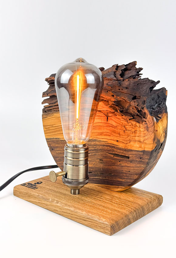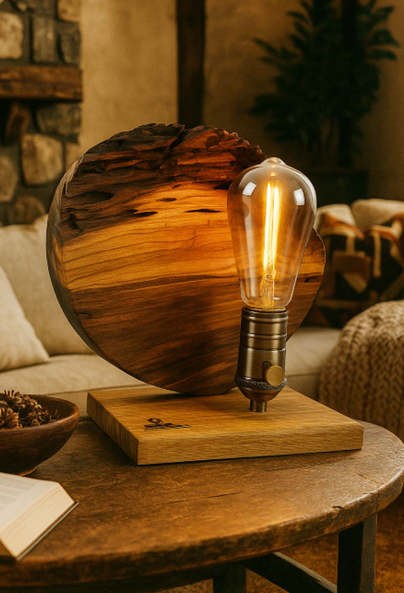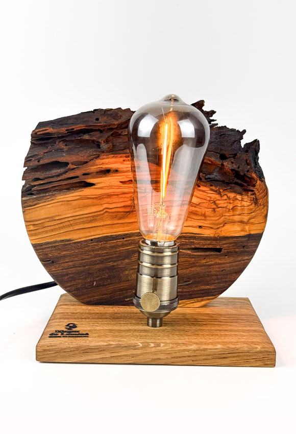 Baza din stejar masiv oferă stabilitate și echilibru vizual, iar soclul metalic vintage E27 completează perfect designul rustic-modern.