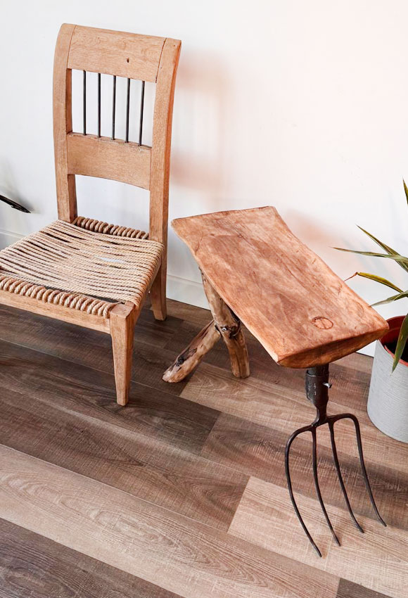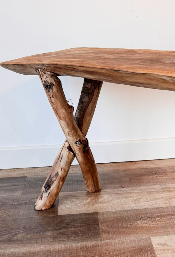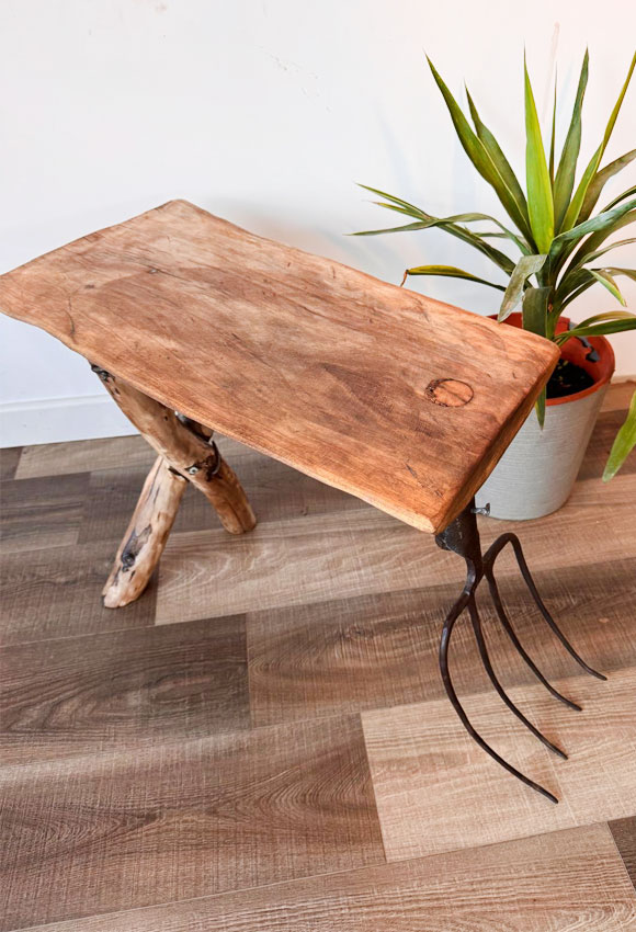 Măsuță de cafea, realizată dintr-o bancă ciobănească de stejar și o furcă de grajd.