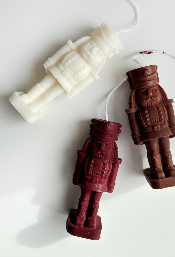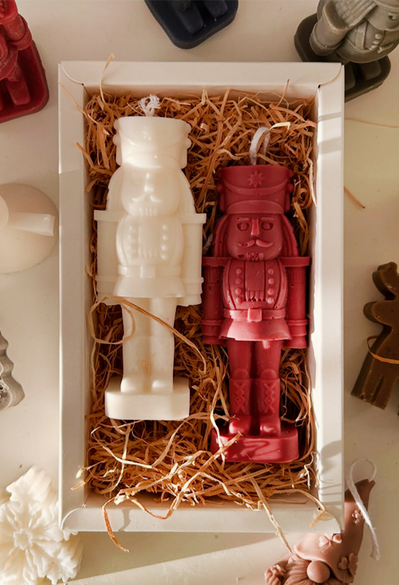 Set de doua lumanari decorative din ceara de soia. Lumanarile vin ambalate in cutie cu funda rosie si cartolina de Craciun.